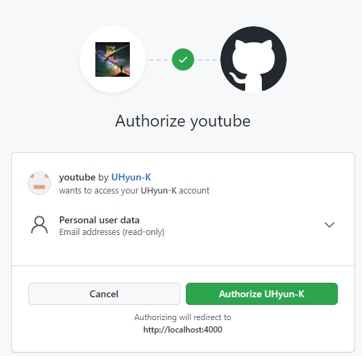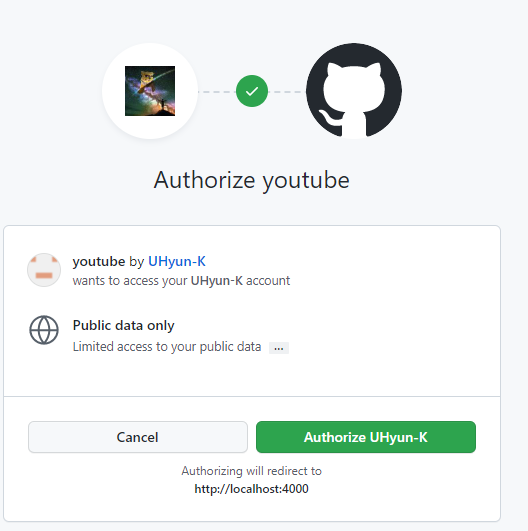 continue with github눌러서 authorazation 누르면 다시 돌아오고 코드를 받는다.