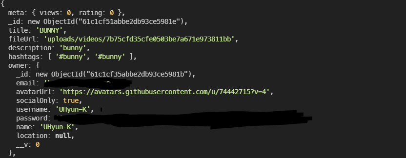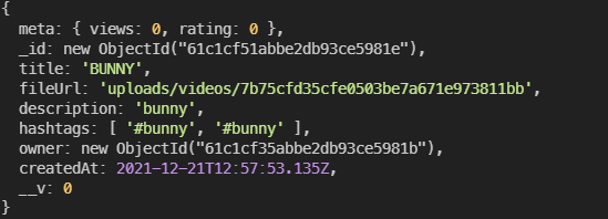 --> 비디오 생성하고 db 열어보면 "owner": ObjectId("61c1cf35abbe2db93ce5981b"),로 속성이 추가됨
