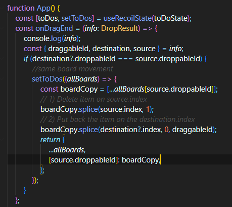 boardCopy should be an array.const boardCopy = oldToDossource.droppableId is not the same as: const boardCopy = [...oldToDossource.droppableId] 배열이여야지 Array.splice() 적용가능